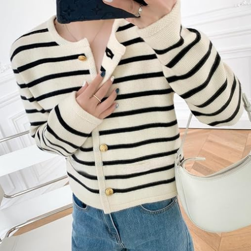 Playful yet polished, this striped knit cardigan blends old-money charm with modern femininity. Its relaxed fit and cropped silhouette make it a chic statement for effortless everyday style.